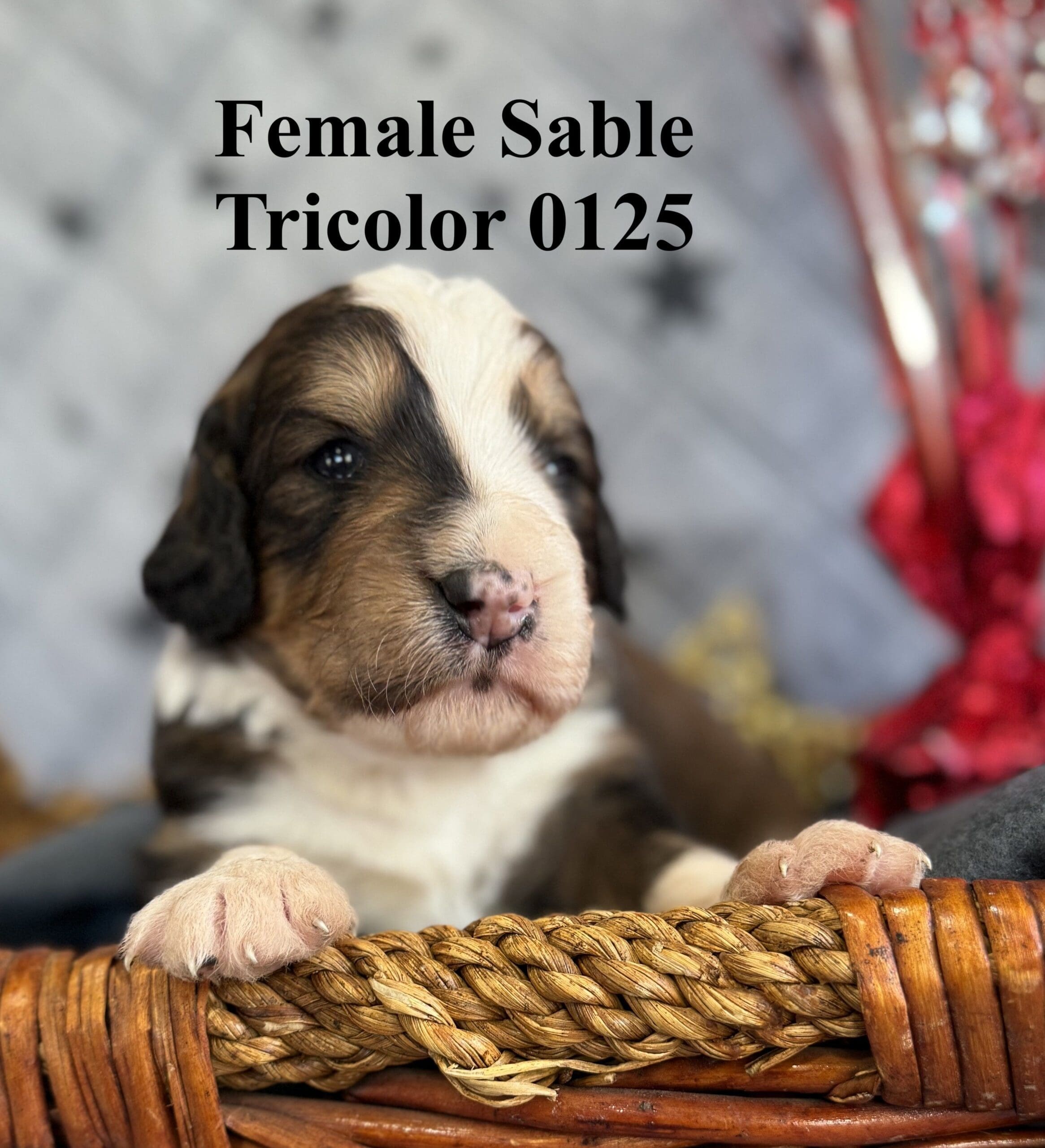 There are 2 males (one tri and one sable tri) and 5 females (3 tri and 2 sable tri) in this litter.